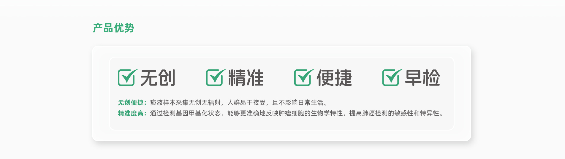 會安心?人類HOXB4、SRCIN1基因甲基化檢測試劑盒(熒光PCR法)于2025年5月29日正式獲批上市,這是首個痰液肺癌甲基化檢測試劑盒。 會安心?通過解讀痰液中脫落腫瘤細胞的基因異常改變(人類HOXB4、SRCIN1基因甲基化)進行肺癌的早期檢測,幫助發現患者早期肺癌病變情 況, 有希望將肺癌阻斷在早期階段,從而達到提前預防和治療肺癌的目的。