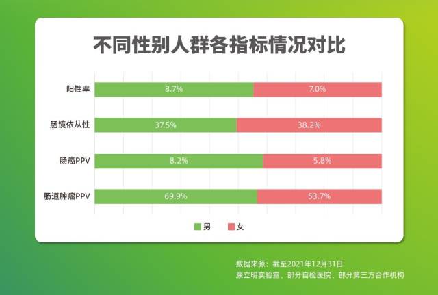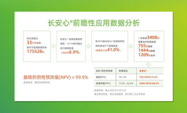 糞便DNA檢測技術,正成為腸癌篩查中的重要一環。康立明生物首席市場官鄧曉琴發布的腸癌糞便基因檢測產品“長安心”最新前瞻性應用數據顯示,截至2021年12月,長安心共完成33萬例前瞻性篩查,其中175528例篩查數據可追溯,12114例受檢者檢測結果陽性(陽性率6.9%),其中4970例檢測結果陽性的受檢者進行了腸鏡復查(腸鏡依從性41.0%),一共發現3408例需要治療的受檢者,其中755例腸癌,1444例腺瘤,1209例息肉?!伴L安心”對腸道腫瘤的陽性預測值(PPV)為68.6%(其中腸癌的陽性預測值為15.2%),來自國家科技部項目的數據顯示,長安心的陰性預測值達99.9%。